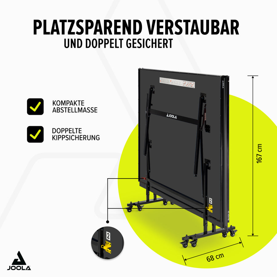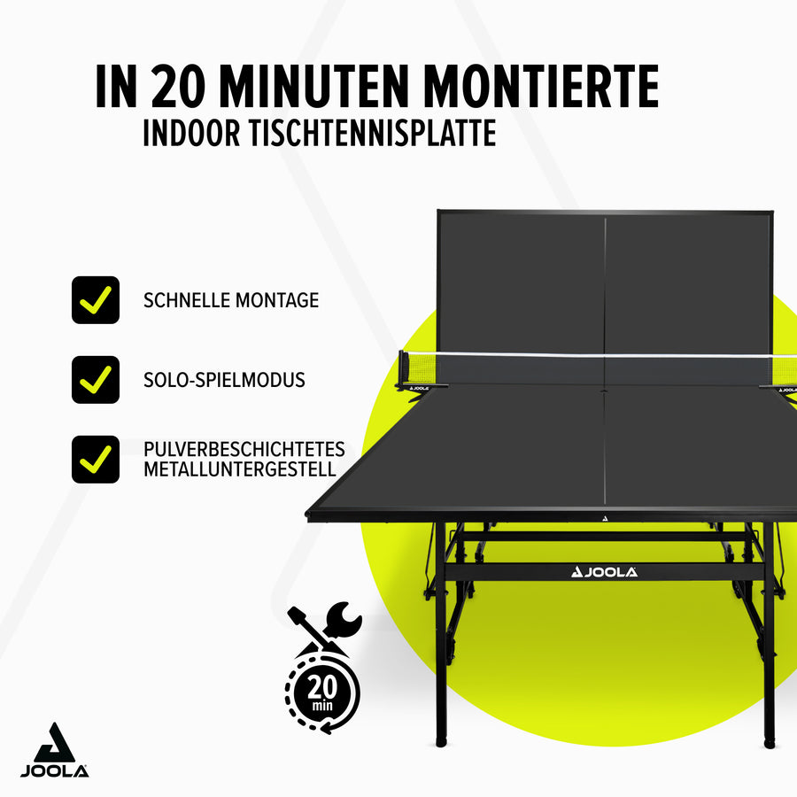 Die JOOLA Tischtennisplatte BLACK 13i überzeugt mit ihrer hervorragenden Verarbeitung, den sehr guten Spieleigenschaften und dem besonders schlichten, eleganten BLACK-Design. Die 12 mm starke Tischoberfläche ist der Garant für einen gleichmäßigen Ballabsprung. Mit zwei separaten, klappbaren Hälften kann die Tischtennisplatte zudem leicht in den Solo-Spielmodus manövriert werden. Der JOOLA BLACK 13i verfügt über eine doppelte Kippsicherung, feststellbare Rollen und höhenverstellbare Füße, die für eine ebene Spielfläche sorgen. Der Tisch wird zu 95% vormontiert geliefert und kann daher in nur 15 Minuten aufgebaut werden. Ein Tischtennisnetz mit praktischem Klemmpfosten ist im Lieferumfang enthalten, sodass es direkt mit dem ersten Match losgehen kann!