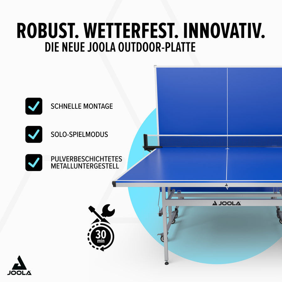 Die JOOLA J100X ist mehr als nur eine Outdoor-Platte – sie ist dein verlässlicher Partner für Tischtennis-Action zu jeder Jahreszeit. Schnell aufgebaut, leicht zu transportieren und extrem stabil – perfekt für Familien, Freunde und alle, die draußen groß aufspielen wollen