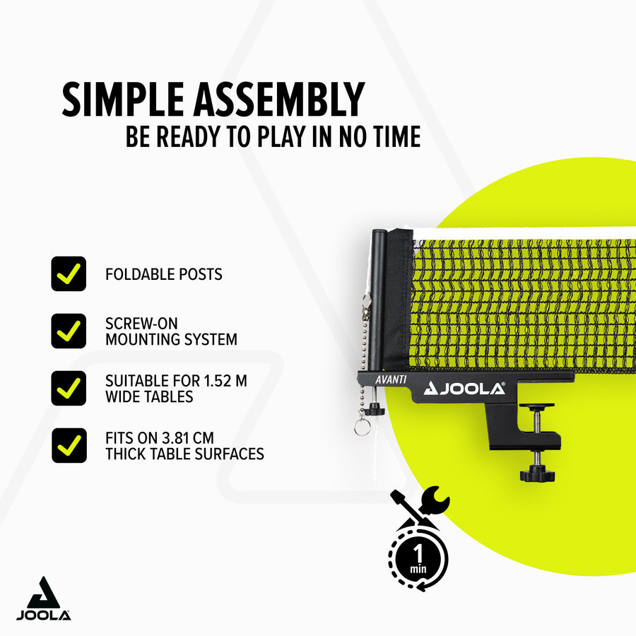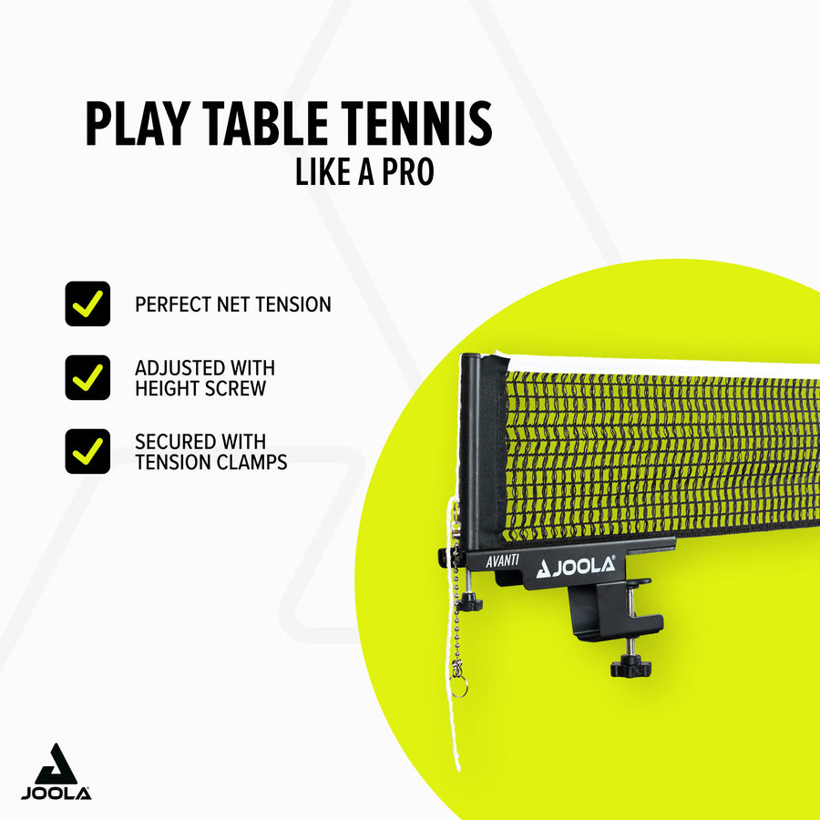 Experience reliable playing enjoyment with the JOOLA Table Tennis Net Avanti – the ideal net fitting for demanding table tennis players!