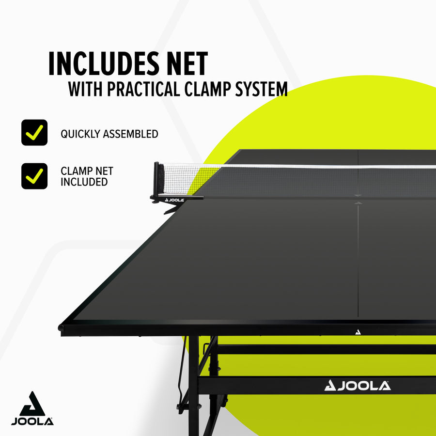 The JOOLA BLACK 13i table tennis table impresses with its excellent craftsmanship, outstanding playing characteristics, and its particularly sleek, elegant BLACK design. The 12 mm thick tabletop guarantees a consistent ball bounce. With two separate, foldable halves, the table can easily be converted into solo play mode. The JOOLA BLACK 13i features a double anti-tilt system, lockable wheels, and height-adjustable feet that ensure a level playing surface. The table is delivered 95% pre-assembled and can be set up in just 15 minutes. A table tennis net with practical clamp posts is included, so you can start your first match right away!