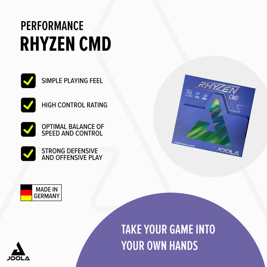 Building on a solid defense, RHYZEN CMD lets you easily switch to offense at any time. The restrained properties during ball release help you in return play and with passive strokes. You always have the feeling of full control over the game because RHYZEN CMD offers you everything you need for a modern and versatile all-round game.