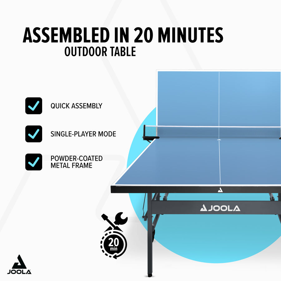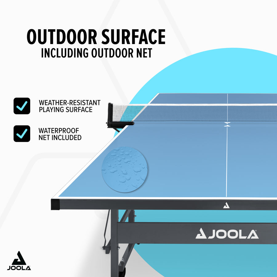 The JOOLA Outdoor Rally TL is a premium table tennis table specifically designed for year-round outdoor use and all weather conditions. With its robust construction and excellent playing characteristics, it meets the highest standards for outdoor table tennis tables. Net set included in the delivery.