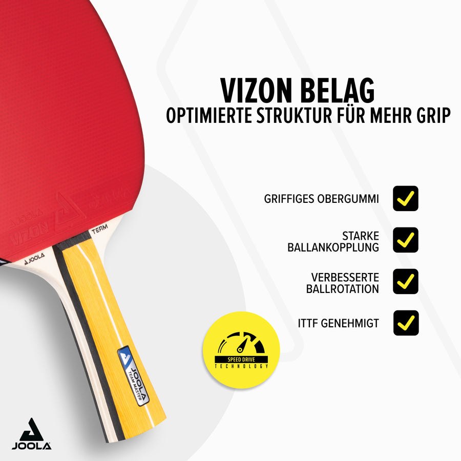 - ITTF-genehmigte JOOLA Vizon Beläge: Diese schnellen Wettkampfbeläge sind ideal für Offensivschläge und bieten maximalen Spin, um dein Spiel auf das nächste Level zu heben.